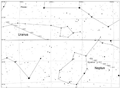 While the planetary disks of Uranus and Neptune hardly show any interesting detail, already medium sized telescopes show satellites of these two outer planets. The main difficulty consists of resolving their faint dots next to the relatively bright planetary disks using indirect vision.