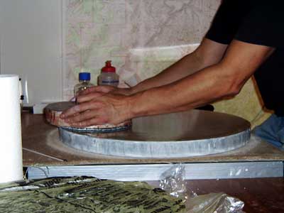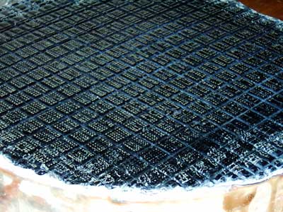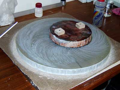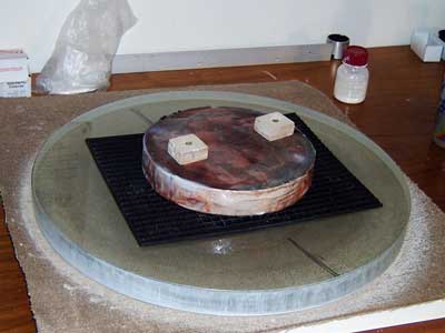 Für die Facettierung habe ich bei diesen kleineren Tools eine Automatte verwendet. Die Pechhaut wird dabei kopfüber in heißes Wasser getaucht und dann mit der Fußmatte als Zwischenlage auf den Spiegel gepresst. Danach wird die Automatte entfernt, noch mal mit einem Fliegengittergewebe als Zwischenlage gepresst, und ganz zum Schluss noch mal ohne. Am Anfang waren die Parabolisierungstools mit 28° Pech belegt. Später verwendete ich weicheres 23° Pech, das besser zu der relativ niedrigen Temperatur im Keller passte. Die Oberfläche des Spiegels wurde mit dem weicheren Pech erheblich ruhiger. Kleine Zonenpolierer (~ 4-5 cm) habe ich auch immer wieder in heißes Wasser getaucht, um sie weich zu halten und somit feinste Kratzer zu vermeiden, die sonst mit diesen kleinen Tools immer wieder auftauchten. |