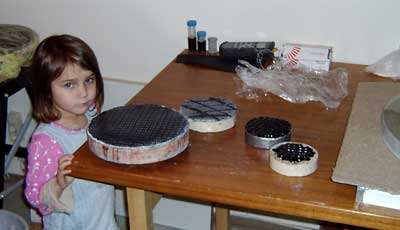 Für das Parabolisieren habe ich ein ganzes Arsenal an Tools verwendet (zum Teil auch aus vorhergehenden Projekten, mit neuer Pechauflage). Als Haupt-Tool diente eine 25 cm Pechhaut, als Zonenpolierer hatte ich Tools mit 15 cm, 10 cm, 5 cm, sowie zwei Spezial-Tools mit 3 cm (Handballen, wenig effektiv) und 1.5 cm (rechter Daumen, sehr effektiv). Als mich Lisa (4) dann fragte, was denn das für schwarzes Zeugs auf den Tools sei und ich ihr das zu erklären versuchte, musste ich feststellen, dass sie Frau Holle nicht kannte! Ist in unserem Märchenbuch einfach nicht drin! Da sieht man wieder, wozu Spiegelschleifen so alles nützlich sein kann. Man kann damit sogar mögliche Kulturgut-Defizite beim Nachwuchs erkennen, und frühzeitig erzieherisch gegensteuern (wobei ich mir dann am Schluss doch nicht mehr so ganz sicher war, was denn nun alles wirklich original aus Frau Holle war und was nicht ... ). |