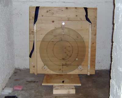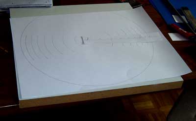 Beim Parabolisieren habe ich mir keine Notizen mehr gemacht. Ich habe viele verschiedene Techniken ausprobiert, manches hat funktioniert, manches nicht. Dieses Experimentieren ist notwendig, um heraus zu finden, wie bestimmte Aktionen sich auf die Oberfläche auswirken (und das ist bei jedem individuell verschieden) . Die prinzipielle Vorgehensweise war folgendermaßen, dass ich zunächst die Mitte ausbaggerte mit der Kantendruckmethode (mehrere Abende!). Dann habe ich mit Rosettenstrichen das Loch in der Mitte zum Rand hin ausgeweitet, um die grobe Parabelform zu bekommen. Zum Schluss ging es dann an die Korrektur einzelner Zonen mit kleineren Tools. Mehrmals habe ich auch mit Daumen die Kante von innen bearbeitet, um ein drohendes Abhängen zu korrigieren. Für die Zonen-Messungen habe ich eine 12-Zonen Coudermaske verwendet, die ich mit einem "Papierzirkel" (siehe rechts) angefertigt habe. Meinen ursprünglichen Schlingen-Teststand habe ich auf Anraten Kurt Schrecklings umgebaut und die Schlinge durch zwei frei drehbare Holzklötze ersetzt. Auf den Holzklötzen befinden sich zwei Teflonstreifen, die den Spiegelrand in seiner Mitte unterstützen. Die