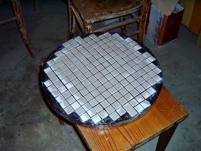 The 2.5 x 2.5 tiles were glued to the tool by fast-binding (5 min) polyester resin. The joints between the tiles were filled as well with resin to prevent Carbo from hiding there. The sides and the back were painted with several layers of varnish. The mirror rested on a piece of carpet and a thick, flat board on a solid table. All the grinding (and polishing) was done tool on top (TOT). |
