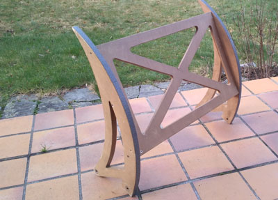Update: Da mir die angeschraubten Höhenräder beim Transport im Auto zu sperrig waren, habe ich den vorderen Bereich der Sicheln zu einem abnehmbaren Kasten umfunktioniert und nochmal leicht vergrößert, um besser das Zusatzgewicht des 80mm Suchers und schwererer Okulare kompensieren zu können. Funktioniert hervorragend und die Stabilität ist mit der zusätzlichen großflächigen Verstrebung voll im grünen Bereich. Durch die Versteifung im vorderen Bereich waren hier 21mm Dicke auch ausreichend und die Höhenräder sind von daher auch nicht mehr hohlgefräst, was den Bau um einiges vereinfacht. |