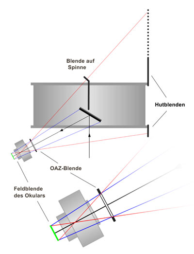 ... spielen eine besondere Rolle beim Lowrider, da bedingt durch den nach oben gerichteten Okularauszug die effiziente Abschirmung des Okulars vor direktem Streulicht sehr wichtig ist. Dies kann erreicht werden durch ausreichend groß dimensionierte Blenden am oberen Tubus (Hutblenden) gegenüber dem Okularauszug. Die Größe dieser Hutblenden kann enorm reduziert werden durch eine Streulichtblende direkt am Okularauszug (OAZ-Blende, siehe oben). Diese OAZ-Blende sollte so platziert werden, dass der Abstand zur Feldblende des Okulars möglichst groß wird, sie aber noch nicht in den Strahlengang ragt. Der optimale Innendurchmesser der OAZ-Blende kann durch einfaches Ausprobieren oder durch eine maßstabsgetreue Zeichnung ermittelt werden. Hierbei geht man vom Okular mit der größten Feldblende aus, das man am Teleskop benutzen möchte. Eine Hülse, die man anstelle dieses Okulars in den OAZ steckt und die das Feld in der Fokusebene auf eben diesen Feldblenden-Durchmesser beschränkt, kann hier beim Ausprobieren gute Dienste leisten. Der Innendurchmesser der OAZ-Blende sollte so groß bemessen sein, dass von jedem Punkt innerhalb der Feldblende des Okulars aus der gesamte Fangspiegel sichtbar ist (entsprechend den blauen Strahlen in der Abbildung), so dass keine Vignettierung auftritt. Die Hutblenden wiederum sollten groß genug sein, dass von keinem Punkt innerhalb der Feldblende des Okulars aus der Rand der Hutblende sichtbar ist (entsprechend den roten Strahlen in der Abbildung). Die Größe der Hutblenden kann weiter verringert werden, wenn man den Abstand der Fokalebene vom Fangspiegel etwas großzügiger auslegt (um z.B. auch Platz für einen eventuellen Filterschieber zu gewinnen) und dadurch einen größeren Abstand zwischen der Feldblende des Okulars und der OAZ-Blende ermöglicht. Alternativ zu einer OAZ-Blende mit festem Innendurchmesser kann auch eine einstellbare Irisblende verwendet werden. Dies ermöglicht eine Anpassung der Blendengröße an das benutzte Okular, und insbesondere eine Verringerung des Blendendurchmessers bei hohen Vergrößerungen. In der Praxis unter dunklem Himmel habe ich jedoch keinen eindeutigen Vorteil gegenüber einer Blende mit festem Innendurchmesser bemerken können. Eine ganz entscheidende Reduzierung der Größe der Hutblende kann durch eine zusätzliche Blende auf der Spinne über dem Fangspiegel erreicht werden. Dies wurde schon bei den Lowridern von Dan Gray (hier und hier) und Roland Hermann gezeigt. Dies ermöglicht alternativ auch größere Kippwinkel a und somit einen größeren Gewinn bei der Einblickhöhe. |