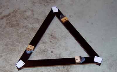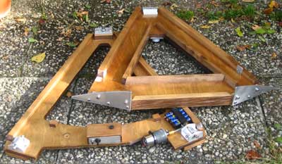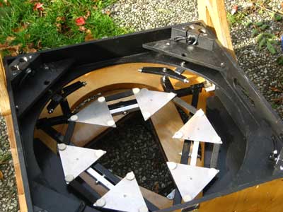 Die Spiegelzelle ... ist als Dreieck konstruiert und wird (im Gegensatz zu den Kriege-Zellen) als Ganzes justiert. Dies vermeidet, dass sich der Spiegel beim Justieren in der Zelle bewegen muss. Es hat aber auch den Nachteil, dass die Zelle sehr stabil und trotzdem justierbar in der Spiegelbox befestigt werden muss. Ulli Vedder hat dieses Problem in seinem 16-Zöller so schön gelöst, dass ich das einfach übernommen habe und mit meinen bescheideneren Fertigkeiten versucht habe nachzubauen. Wer das also in Perfektion sehen will, sollte bitte lieber auf Ulli's Seite nachschauen. Die bisherigen Erfahrungen sind bisher durchweg positiv, auch bei meinem schweren Spiegel. |
