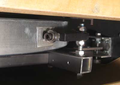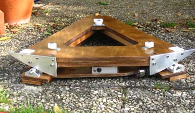 Das Bodenbrett ... besteht aus 12 mm Siebdruckplatten. Die Rollen, die die Rockerbox auf dem Lager führen, sind ganz gewöhnliche Möbelrollen. Es gibt ab und zu Missverständnisse, was die Rollenführung des Azimutlagers bei unten offenen Rockerboxen angeht. Die einzige Aufgabe der Rollen besteht darin, ein Herunterrutschen der Rockerbox vom Bodenbrett zu verhindern. Sie können deshalb ruhig mit viel Spiel in der Aussparung der Rockerbox sitzen, die aus demselben Grund auch nicht "perfekt" rund sein muss (anders als die Höhenlager). |