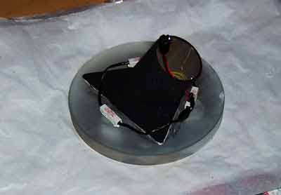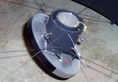 Der Fangspiegel (mehr dazu hier) hat 150mm Durchmesser und ist 15 mm dick. Seine 800g Eigengewicht verlangen schon einiges an Stabilität bei der Konstruktion des Huts, der Spinne und des Halters. Der Fangspiegel ist mit Silikon auf die Halterplatte aufgeklebt und besitzt eine 1 W Fangspiegelheizung aus 3 x 3Ohm Leistungswiderständen, die über 2 Mignonbatterien (können bei Bedarf in den FS-Halter gesteckt werden) versorgt werden, die jeweils für einige Stunden Heizung ausreichen sollten. Zu Anfang war ich mir nicht sicher, ob die Heizung wirklich nötig ist, da der Fangspiegel durch seine Größe ja eine ziemliche Wärmekapazität hat. Mittlerweile war ich aber schon einige Male froh drum. Die Leistungsauslegung scheint genau richtig zu sein. Um einen zugetauten Fangspiegel zu enttauen, braucht es ein zusätzliches Anwärmen mit den Händen, für das dann folgende Freihalten des FS ist die Heizung dann ausreichend. Genauso sollte es auch sein.