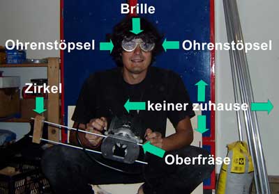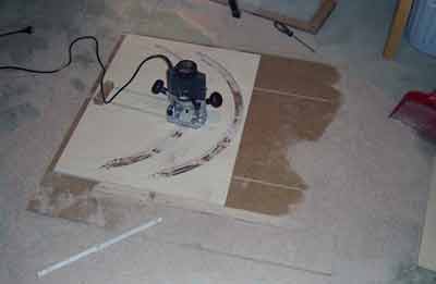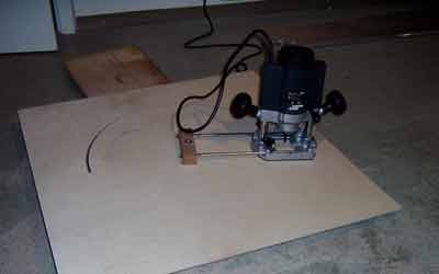 Für das ganze Gefräse habe ich eine Unterlage aus 12 mm MDF-Platte gebaut mit Anschlägen und einer festen Zirkelschraube, um die vier Einzelteile passgenau herstellen zu können. |