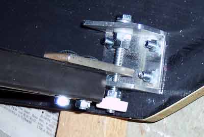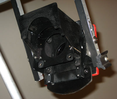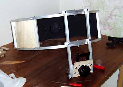Lateral ruht der Spiegel auf zwei im 90° Winkel angeordneten Wippen aus Alu mit Kugellager-Rollen, die den Spiegelrand in der Schwerpunklinie unterstützen. Als Gegenfläche wurden auf dem Spiegel 0.5mm Alubleche aufgeklebt. |