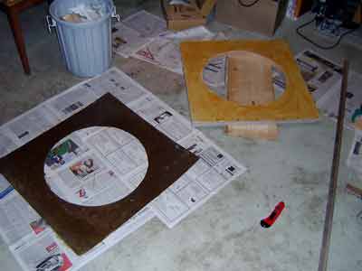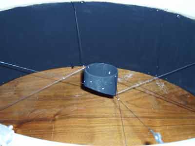Als Gegenmaterial zum Teflon dient Ebony Star Laminat. Es wurde mit einem scharfen Bastelmesser zugeschnitten und mit Kontaktkleber aufgeklebt. Im Azimut hat sich die Kombination Ebony Star/Teflon sehr gut bewährt, die Bewegung ist sehr feinfühlig, ohne Kleben, selbst wenn das Teleskop aufrecht steht. Die Rockerbox wurde dann, wie auch die Spiegelbox, mehrfach geölt und gewachst. |