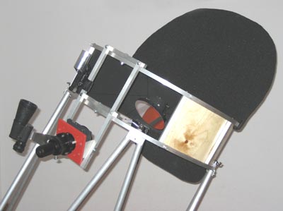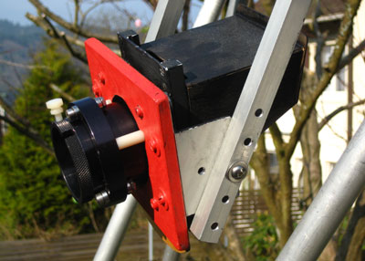 Der Fangspiegelhalter ... ist ähnlich wie bei meinem 14-Zöller. Nur eine Nummer größer. Das Außenrohr ist 70 mm Alu, das Innenrohr 50 mm Alu, die Halterplatte aus 3 mm Alu. Das Ganze wird über M4 Schrauben justiert und besitzt eine Sicherheitsleine, damit der Fangspiegelhalter samt Fangspiegel nicht aus dem äußeren Rohr rausrutschen kann.