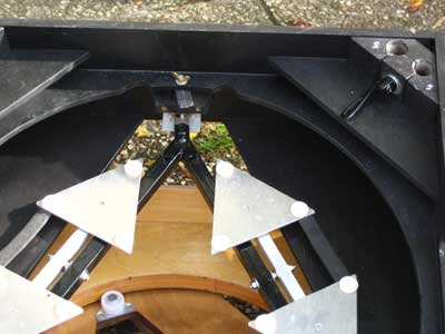 Höhenräder ... haben 770 mm Durchmesser und sind 30 mm dick. Das gibt die nötige Stabilität auch bei horizontnaher Beobachtung. Die Sicheln bestehen aus jeweils zwei Halbteilen aus 15 mm Multiplex, die innen hohlgefräst wurden, ähnlich wie beim 24" von Stathis Kafalis. Das Lagermaterial für die Höhenräder ist Ebony Star. Zunächst hatte ich grob strukturiertes Alublech verwendet (Rauhfaser oder Stucco-Design), was sich aber auf Dauer als zu schwergängig und ruckelig herausstellte.