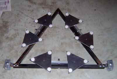 Wie die meisten sicher unschwer erkennen können, ist das eine 18-Punktzelle. Die Lagerbalken sind aus 15 x 15 x 1mm Alu-Vierkant-Profil auf M6 Schrauben, die Lagerdreiecke aus 3 mm Alublech. |