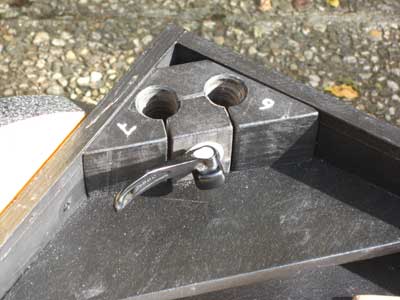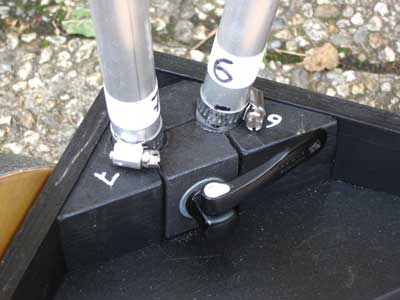 Die Klemmblöcke waren anfänglich außen an der Spiegelbox angebracht. Inzwischen habe ich sie nach innen in die Ecken verlegt, damit man beim Tragen weniger hängen bleiben kann (Türrahmen, etc.) . Die Löcher wurden auf einer Standbohrmaschine mit einem Fräsbohrer (ähnlich wie ein Förstnerbohrer) im richtigen Winkel gebohrt. Der Klemmblock kann dann mit einer Stichsäge ausgesägt werden. Die Stangen haben