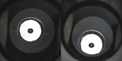 Der Blick durch den OAZ zeigt sowohl bei geradem Einblick (links) als auch bei maximal schrägem Einblick (rechts) außer dem Fangspiegel mit der Reflektion des Hauptspiegels nur schwarze Flächen des Teleskops und der Baffles. So sollte es sein! |