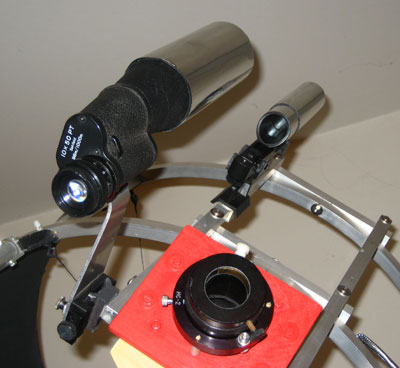 Die Sucher Ich verwende als Sucher einen Skysurfer Leuchtpunktsucher von Baader und einen optischen Sucher. Bis vor kurzem war der optische Sucher ein halbes 10x50 Fernglas mit Fadenkreuz (10 Euro bei eBay = zwei Sucher). Geradsichtiger Einblick und ein aufrechtes Bild sind für mich wichtige Eigenschaften eines guten Sucher, alles andere ist umständlich und erschwert die Orientierung.