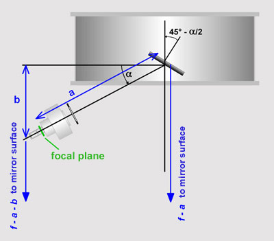 Planning a Lowrider: Calculation of the eyepiece position is best done by a drawing. The distance a between the focal plane (in green) and the secondary mirror should be large enough to accommodate focuser, focuser travel, a focuser baffle, and other parts as for instance a filter slide. b can be obtained from the drawing, taking into account also the approximate size of the eyepiece. The distance between the eyepiece and the mirror is f - a - b, where f is the focal length of the primary. The eyepiece position above ground is obtained by adding the distance from the primary to the ground. In an optimized large Dobsonian, 20 cm are a good estimate for the latter distance. The design of a Lowrider can be done with the same computer software written for classical Newtonians (for instance Newt). The larger value of the distance a as compared with a classical Newtonian can be taken into account by increasing, for instance, the value of the tube thickness accordingly in the software. Front baffle diameter, small axis of the secondary, and illuminated field can then be calculated correctly by the software. |