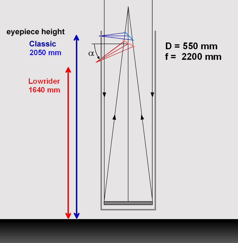 increased, leading to a still very acceptable central obstruction of 25%. Tilt angles alpha of 30° can be used without running into baffling problems (larger tilt angles, however, may impose serious problems). In the example to the right, the Lowrider design lowers the height of the eyepiece by roughly 40 cm. In combination with a fast f/4 focal ratio, the eyepiece position is low enough even for a 22" aperture to allow for observing with your feet on the ground. |