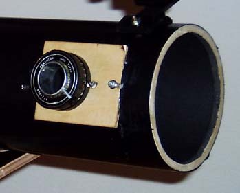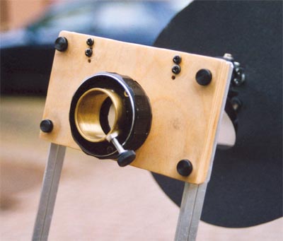 Die Optik mit Blende des Objektivs war nur über drei Schrauben fixiert, die nach Abschrauben einer Abdeckung zugänglich waren und einfach ausgebaut werden konnte. Nach Entfernen des Blendenrings blieb somit nur noch die Fokussiermechanik übrig. Die Okularaufnahme besteht aus einem 25 mm langen Messingrohr, dessen Innendurchmesser auf 1 1/4 Zoll gedreht wurde. Dieses wurde in einen Aluminiumring eingepasst (aus 1mm Alu gesägt), und beides zusammen mit 3 Schrauben an Stelle der ehemaligen Optik in die Fokusmechanik eingeschraubt. Der fertige Fokussierer wurde in ein Sperrholzbrett eingepasst und über drei radiale Schrauben fixiert. Zusätzlich wurde noch eine Streulichtblende hinter den Fokussierer geklebt. |