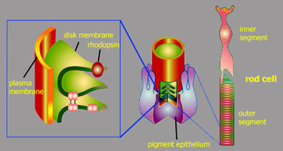 of a rod cell Let's take a closer look at a rod cell. The rod photoreceptor cells consist of an inner segment with the nucleus and an outer segment. These outer segments contain stacks of membrane vesicles termed disk membranes, that are densely packed with the actual photoreceptor in the cell, the visual pigment rhodopsin.