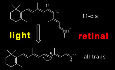 Rhodopsin activation Rhodopsin is a quite special member of this receptor family, as it has its light-sensitive ligand, the vitamin A derivative retinal, permanently bound. It is buried in the retinal binding pocket of rhodopsin as a kinked 11-cis isomer that is covalently bound to the protein via a protonated Schiff base. Due to its special electronic structure, it lends the photoreceptor its 500 nm absorption maximum (slightly longer for human rhodopsin). When retinal absorbs an incoming photon, it converts in one of the fastest (200fs) and most efficient (67% quantum yield) photochemical reactions at all to the straight all-trans form.