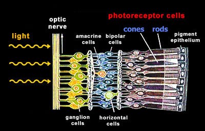 retina Our retina has two general types of photoreceptor cells, the rods and the cones. Unexpectedly and mostly for evolutionary reasons, these photoreceptor cells are localized at the back of our retina. Light needs to traverse several layers of nerve cells before it reaches the light-sensitive photoreceptor cells.